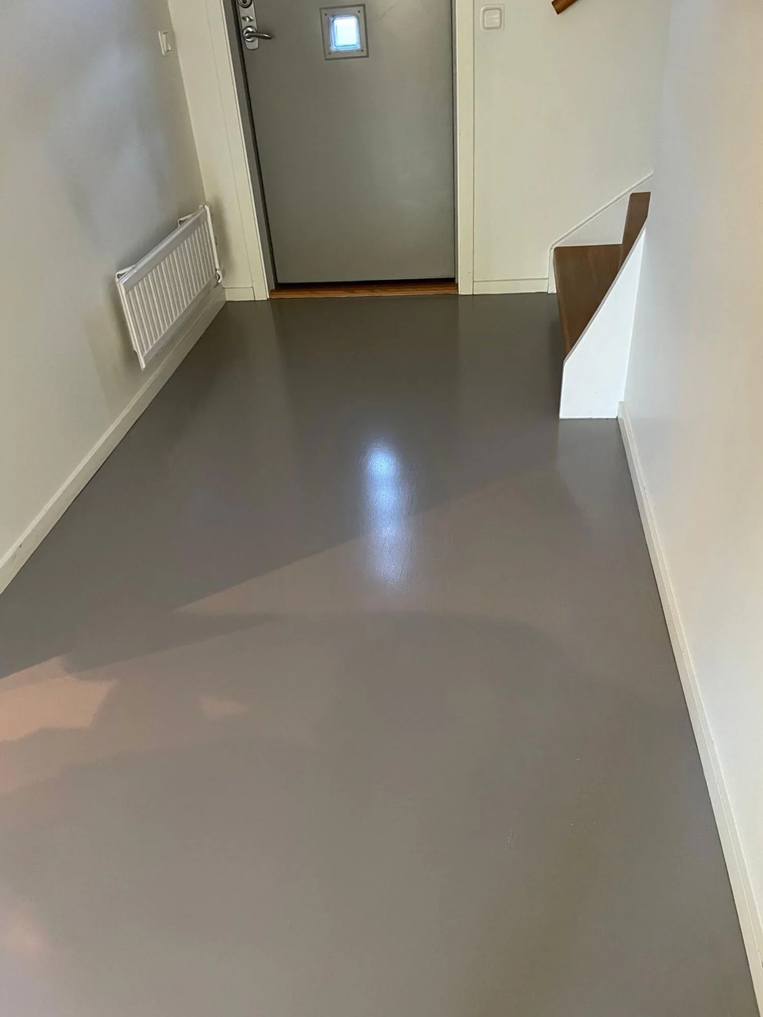Grundmålning och golvfärg – betongen målades med slitstark färg anpassad för inomhusmiljö.